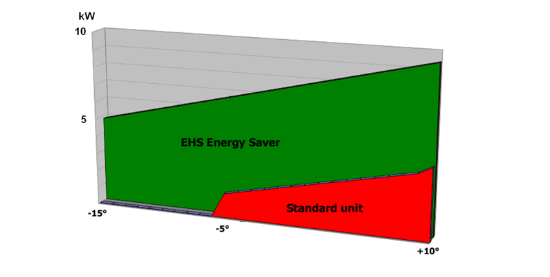In contrast, the EHS Energy saver retains 80 % of the total capacity at - 4 º C, and is certified to work down to minus 15º C, where it still retains 65-70 %